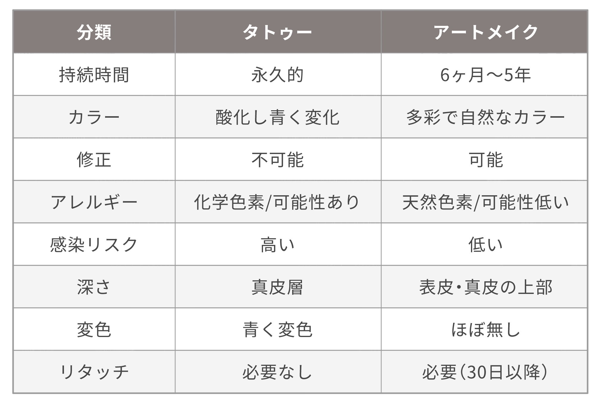 また、アートメイクとタトゥーには以下の表のとおり、様々な違いがあることも理解しておきましょう。